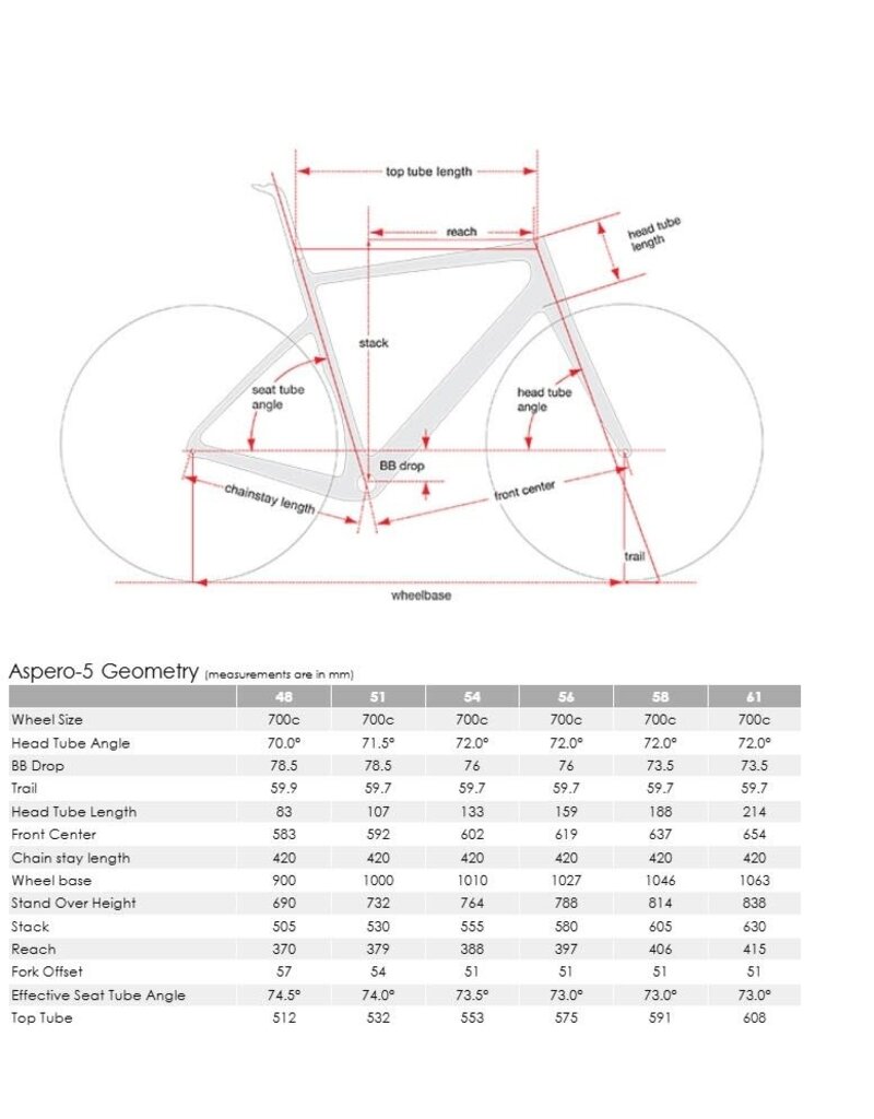 | Top Tube Length | mm | 516 | 531 | 552 | 574 | 591 | 607 |