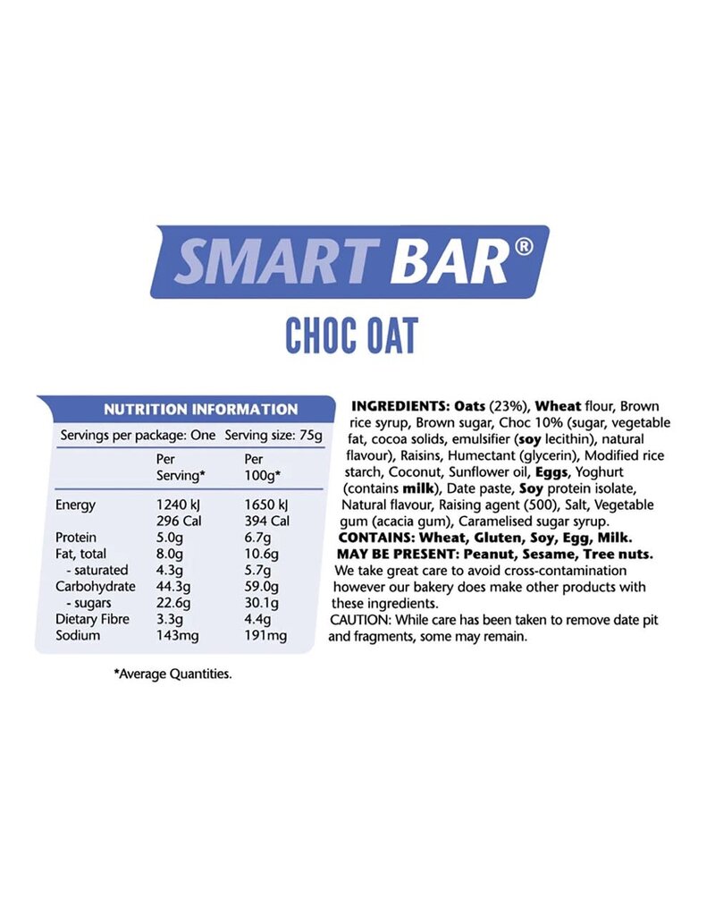 Oats 23%, Wheat flour, Brown rice syrup, Brown sugar, Choc 10% (sugar, vegetable fat, cocoa solids, emulsifier (soy lecithin), natural flavour), Raisins, Humectant (glycerine), Modified Rice starch, Coconut, Sunflower oil, Eggs, Yoghurt (contains milk), Date Paste, Soy protein isolate, Natural Flavour, Raising agent (500), Salt, Vegetable gum (acacia gum), Caramelised sugar syrup.