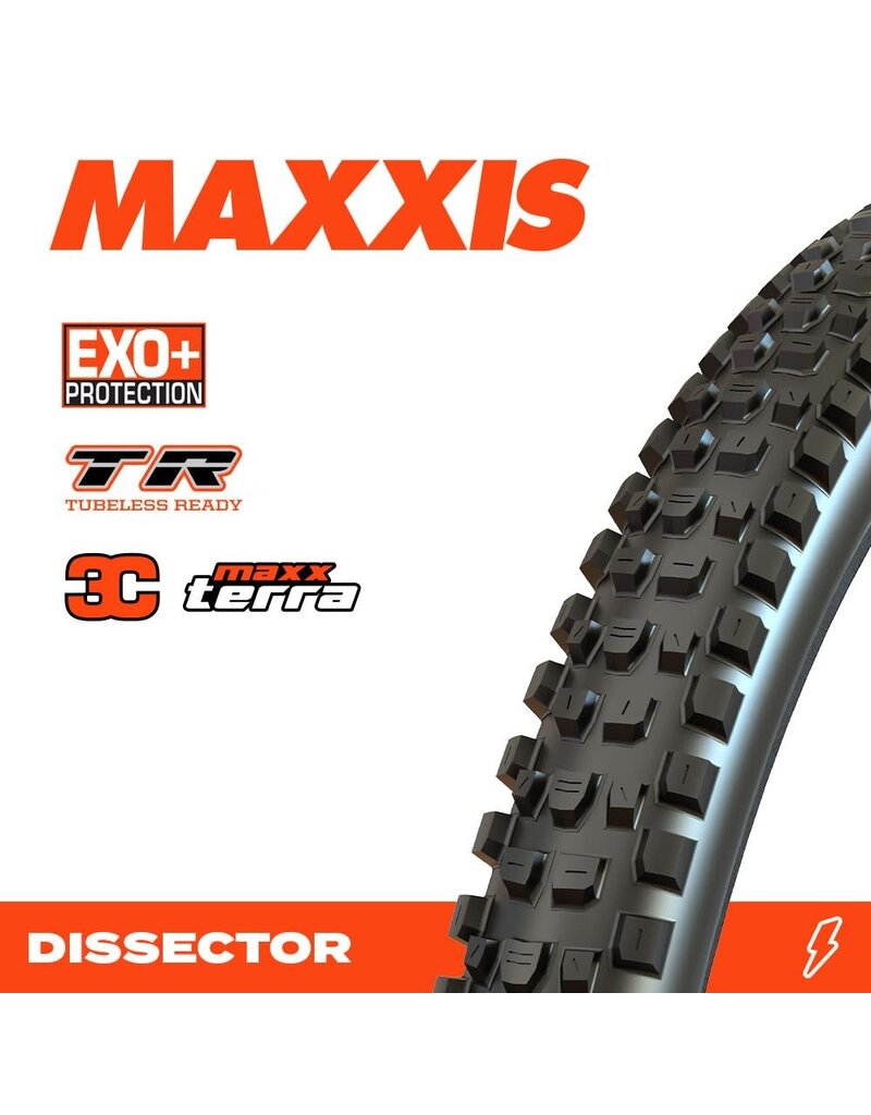 The new Dissector is available now in a 29x2.40 size with EXO, EXO+, and DoubleDown casing options and a choice of MaxxTerra or MaxxGrip rubber compounds.