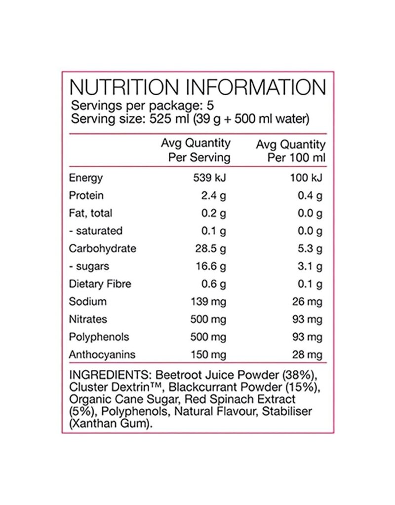 Recommended use: Take one serve daily for 5 days leading into an event. Mix contents of sachet with 500ml of water and shake well. Consume within 4 hours of mixing.