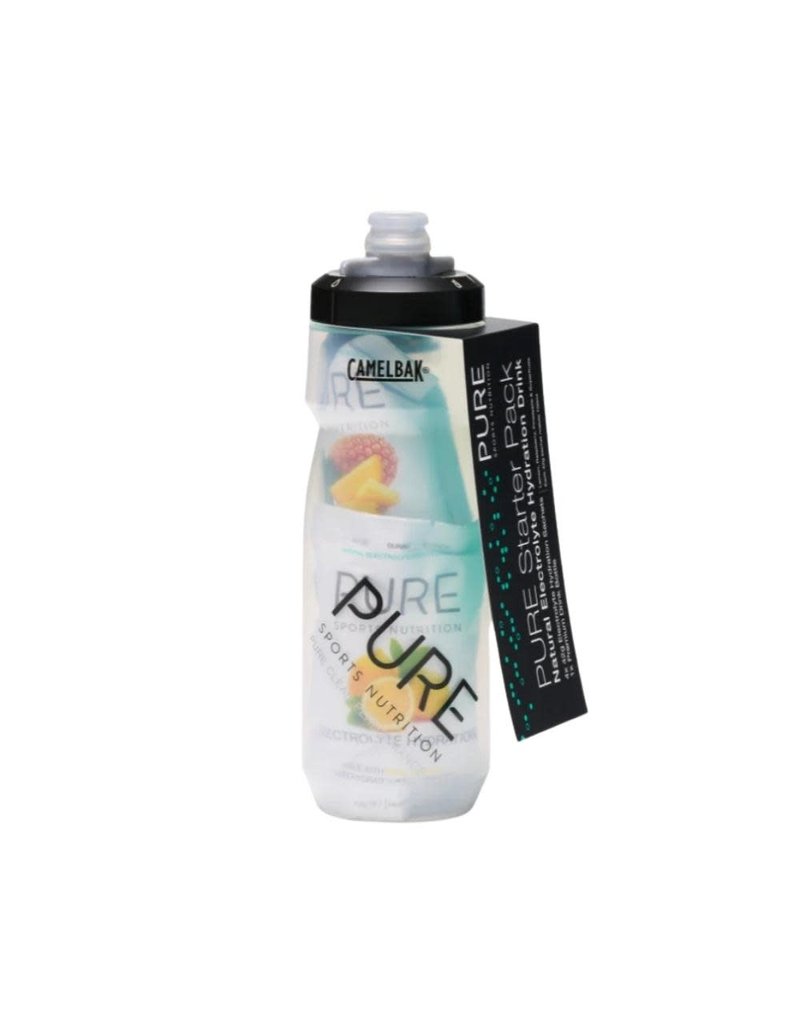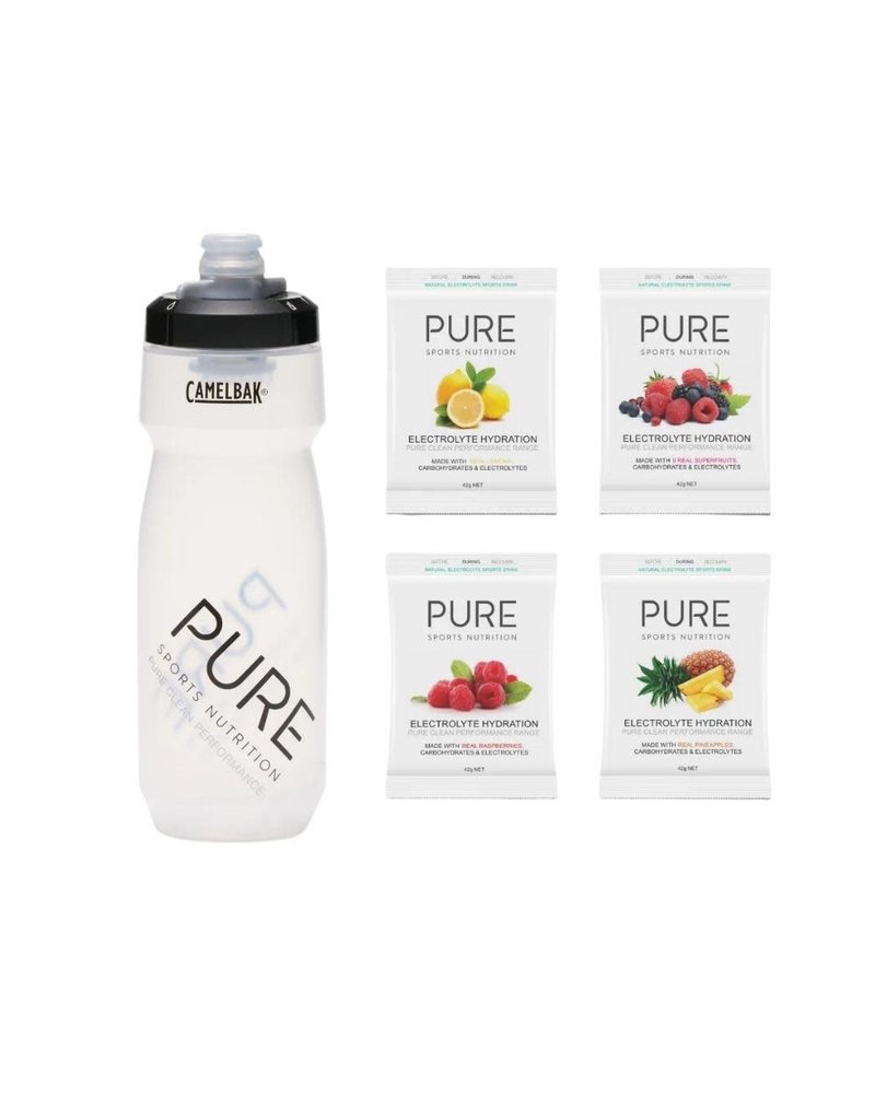 4 x 42g single-serve PURE Electrolyte Hydration sachets (1 of each flavour: Raspberry, Pineapple, Lemon & Superfruits) PURE CamelBak Podium 710ml water bottle.